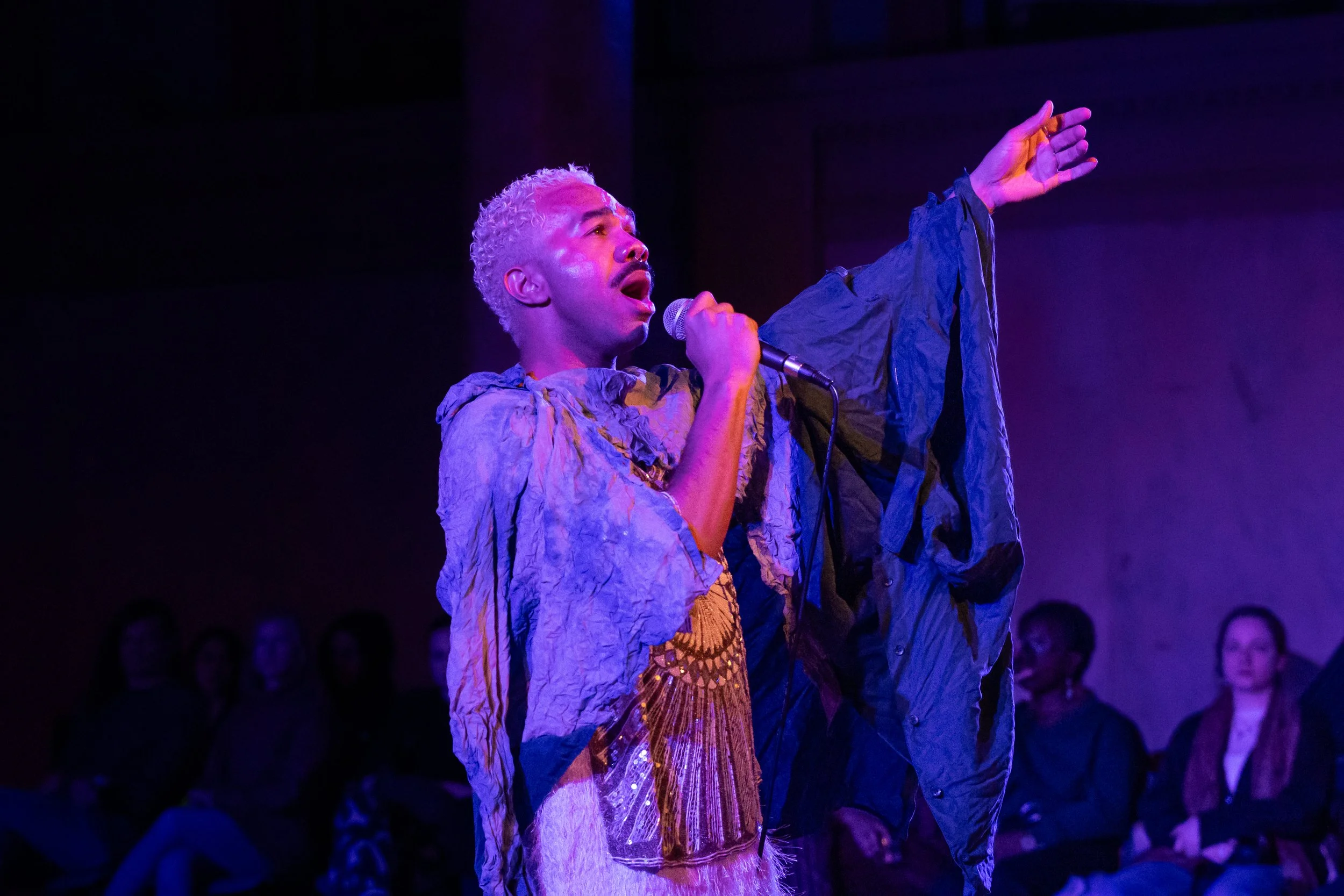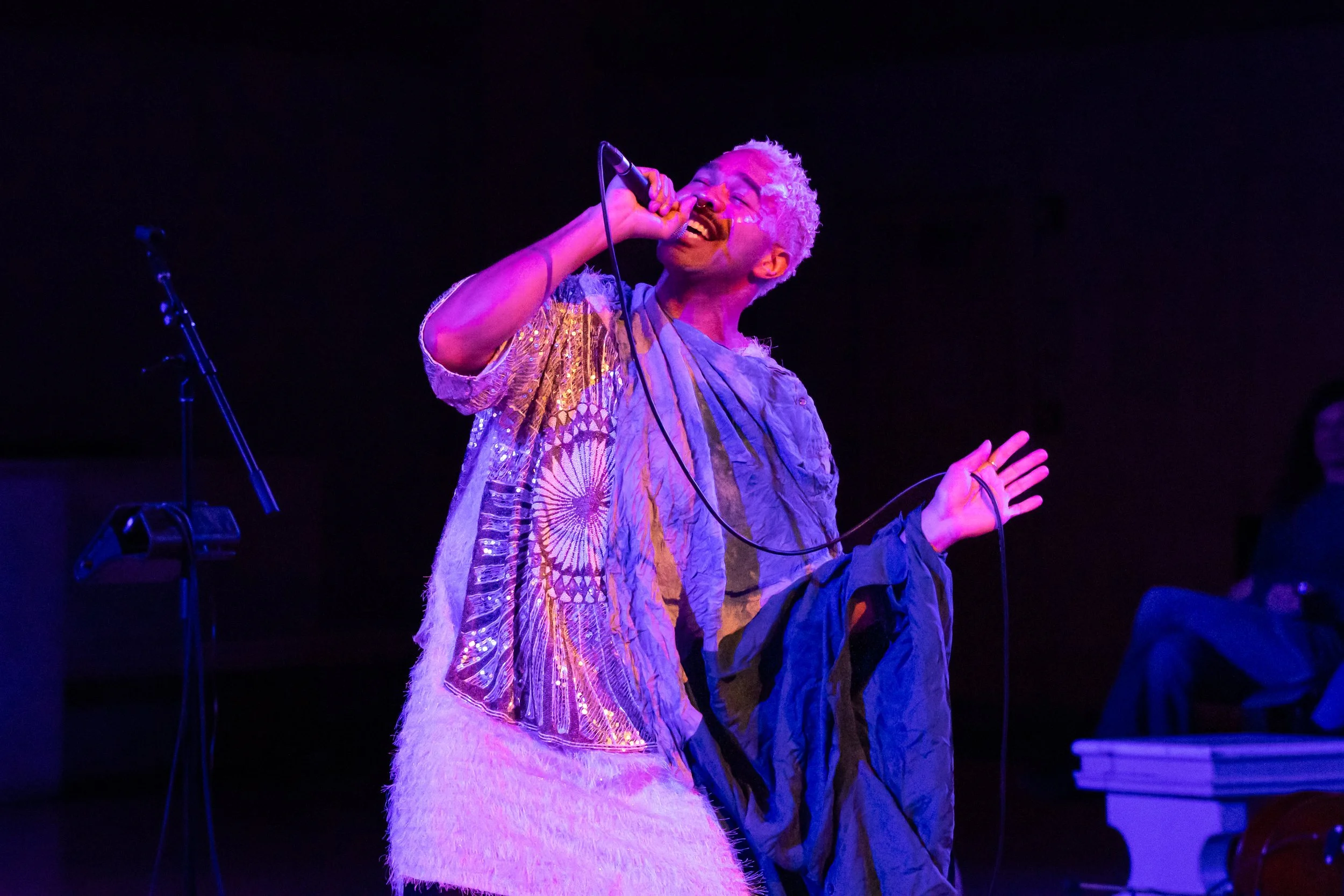 Tone Pillar is assembled from research and snapshots of a quarantine and uprisings, rooted in blackness, in trans-queer identity, in neurodiversity, and with magic. The veil has only continued to weaken, truths submerged rise to the surface. Tone Pillar accumulates through bent genres, arias of longing serve as musical anchors, movement that conjures meditative states open portals, protagonists building worlds and revolutions, this live work builds an absurd Atlantis and invites the audience in. Grae engages in the thrills of virtuosity through systems of alignment that focus on stories and vehicles of transformation that happen in the steps of a protest and the thump of the dancefloor.